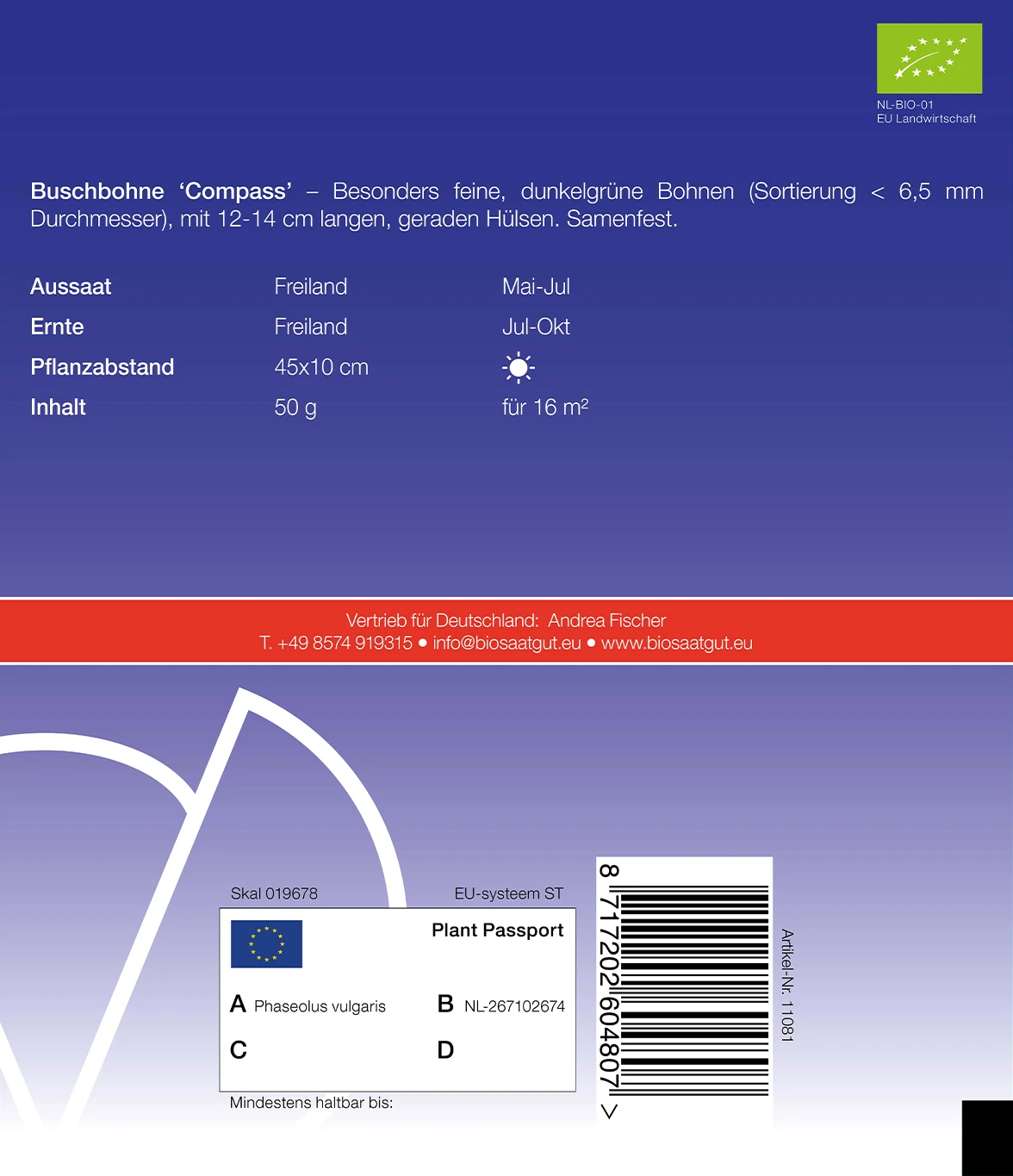 Besonders feine, dunkelgrüne Bohnen ( Sortierung < 6,5 mm Durchmesser), mit 12 – 14 cm langen, geraden Hülsen.