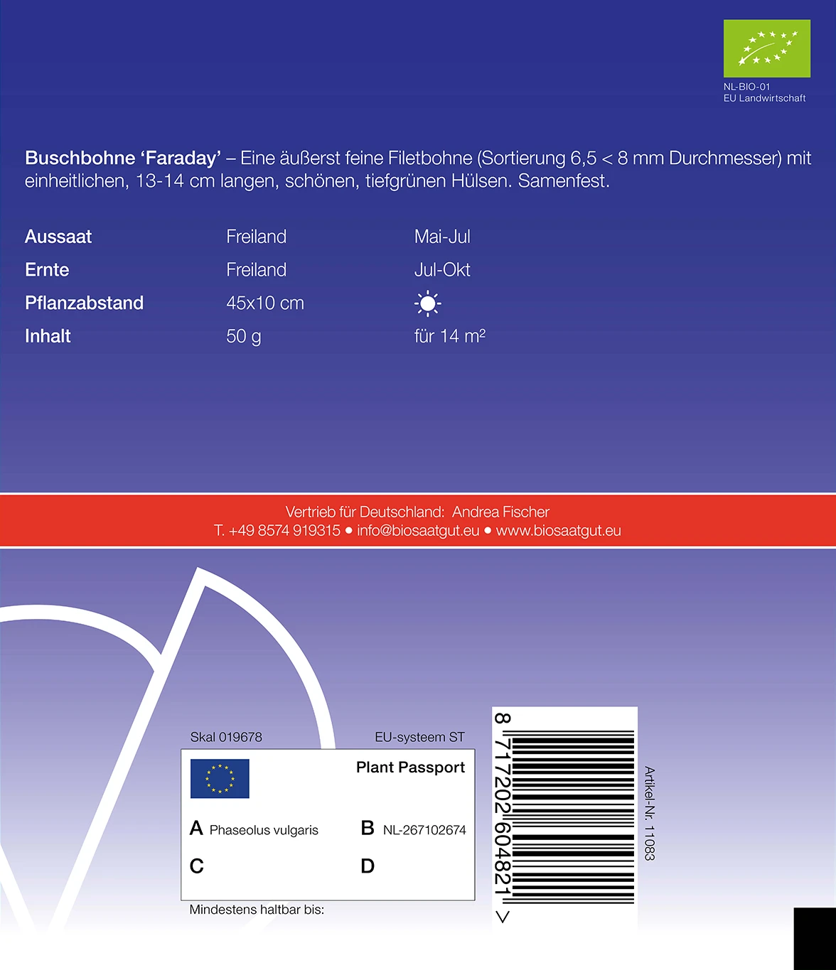Eine äußerst feine Filetbohne ( Sortierung 6,5 < 8 mm Durchmesser) mit einheitlichen, 13 – 14 cm langen, schönen, tiefgrünen Hülsen. Samenfest.