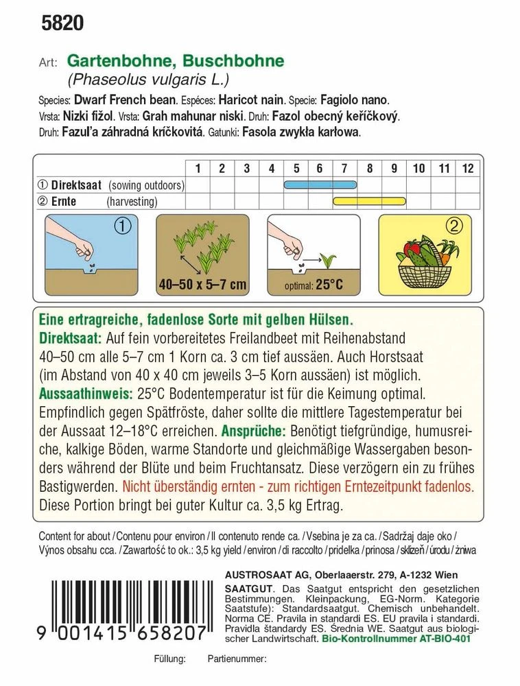 Die Austrosaat Buschbohne Dior BIO (Phaesolus vulgaris L.) ist eine mittelspÀte Buschbohne mit mittellangen, gelben Bohnen. Sie erreicht eine Wuchshöhe von ca. 50 cm. Buschbohne Dior ist zum richtigen Erntezeitpunkt fadenlos.
