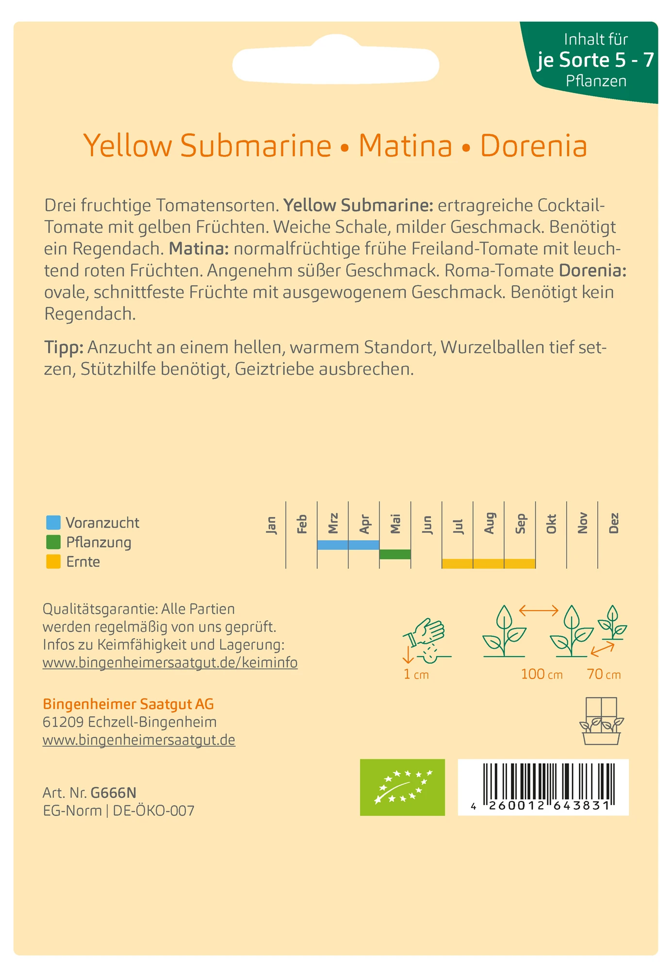 Drei fruchtige Tomatensorten. Yellow Submarine: ertragreiche Cocktail-Tomate mit gelben Früchten. Weiche Schale, milder Geschmack. Benötigt ein Regendach. Matina: normalfrüchtige frühe Freiland-Tomate mit leuchtend roten Früchten. Angenehm süßer Geschmack. Roma-Tomate Dorenia: ovale, schnittfeste Früchte mit ausgewogenem Geschmack. Benötigt kein Regendach.