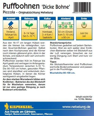 Piccola ist eine kleine, zarte Gourmet-Puffbohne. Aus den 16–17 cm langen Hülsen werden die jungen, grünen Bohnen geerntet. Sie bleiben auch nach dem Kochen noch intensiv glänzend grün. Die Schale ist dünn und sehr zart. Beim Trocknen wird das Korn bräunlich. Puffbohnen werden früh im Februar bis Ende März gesät und vertragen im Anfangsstadium Temperaturen zwischen 5–10 °C. Die 90–100 cm hohen, gesunden Pflanzen sind standfest und entwickeln dunkelgrüne Hülsen, in denen die Körner eingebettet liegen. Originalzüchtung Nebelung. Das durchschnittliche Tausendkorngewicht der Sorte beträgt etwa 1200 g.