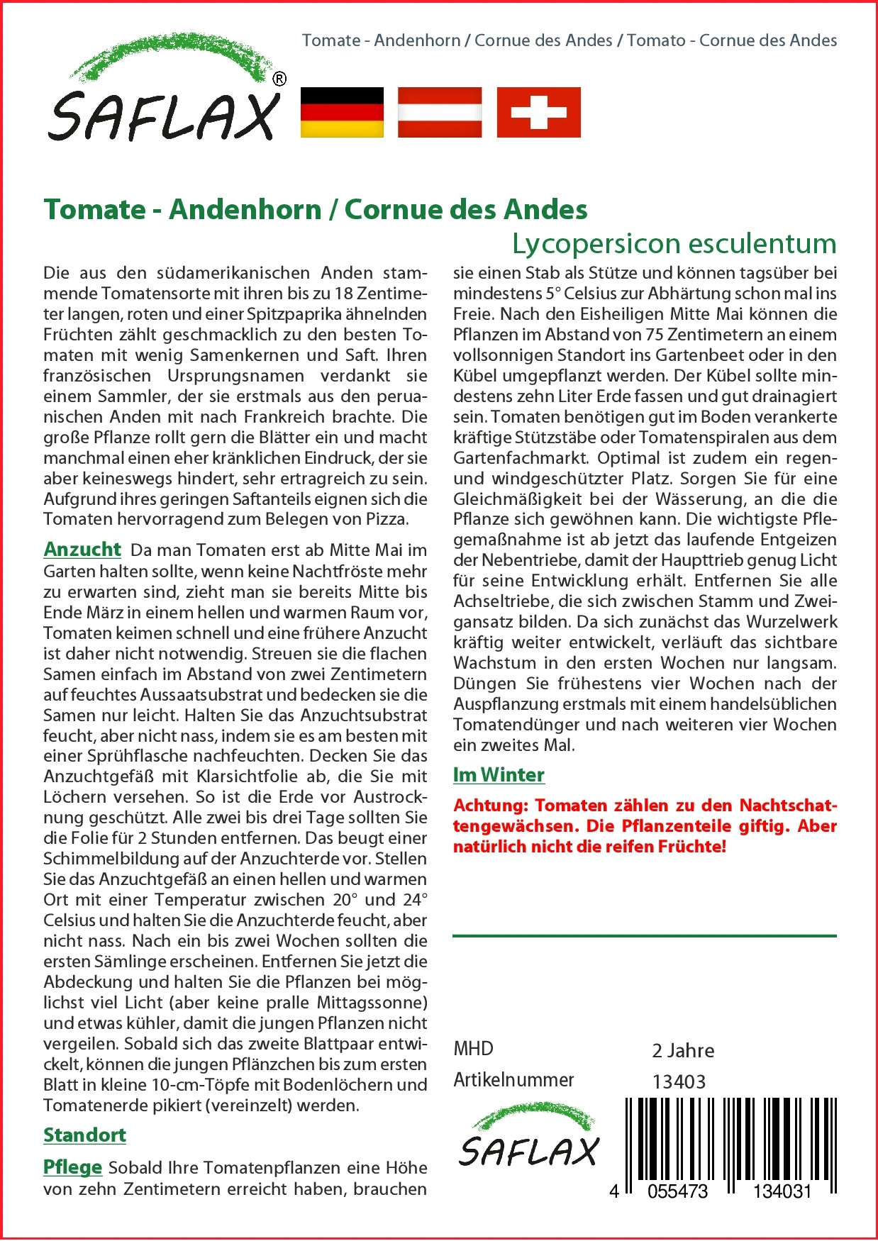 Da man Tomaten erst ab Mitte Mai im Garten halten sollte, wenn keine Nachtfröste mehr zu erwarten sind, zieht man sie bereits Mitte bis Ende März in einem hellen und warmen Raum vor, Tomaten keimen schnell und eine frühere Anzucht ist daher nicht notwendig. Streuen sie die flachen Samen einfach im Abstand von zwei Zentimetern auf feuchtes Aussaatsubstrat und bedecken sie die Samen nur leicht. Halten Sie das Anzuchtsubstrat feucht, aber nicht nass, indem sie es am besten mit einer Sprühflasche nachfeuchten. Decken Sie das Anzuchtgefäß mit Klarsichtfolie ab, die Sie mit Löchern versehen. So ist die Erde vor Austrocknung geschützt. Alle zwei bis drei Tage sollten Sie die Folie für 2 Stunden entfernen. Das beugt einer Schimmelbildung auf der Anzuchterde vor. Stellen Sie das Anzuchtgefäß an einen hellen und warmen Ort mit einer Temperatur zwischen 20° und 24° Celsius und halten Sie die Anzuchterde feucht, aber nicht nass. Nach ein bis zwei Wochen sollten die ersten Sämlinge erscheinen. Entfernen Sie jetzt die Abdeckung und halten Sie die Pflanzen bei möglichst viel Licht (aber keine pralle Mittagssonne) und etwas kühler, damit die jungen Pflanzen nicht vergeilen. Sobald sich das zweite Blattpaar entwickelt, können die jungen Pflänzchen bis zum ersten Blatt in kleine 10-cm-Töpfe mit Bodenlöchern und Tomatenerde pikiert (vereinzelt) werden.
