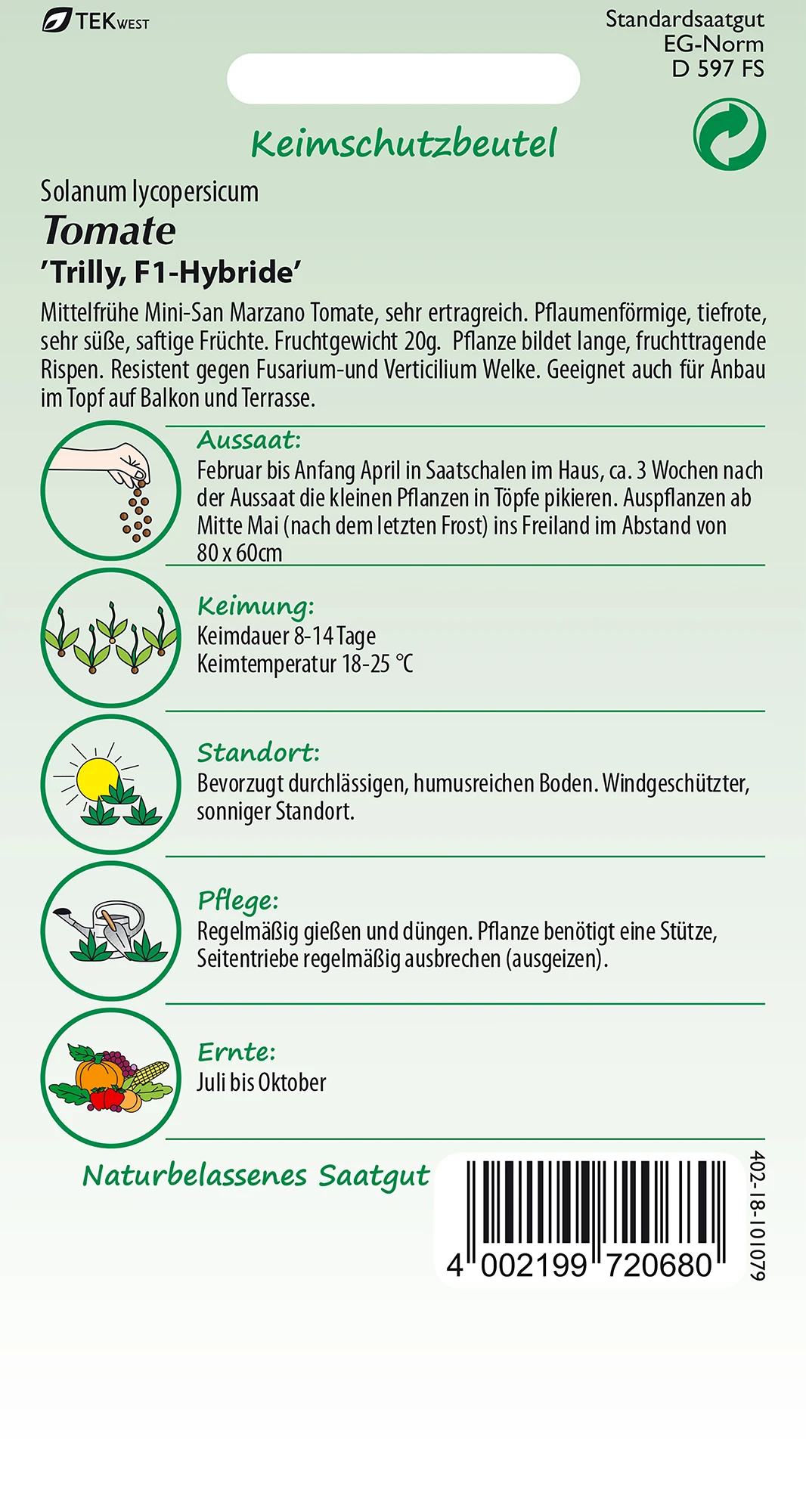Keimdauer 8 – 14 Tage. Keimtemperatur 18 – 25 °C