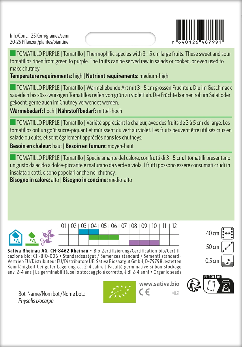 Wärmeliebende Art mit 3 – 5 cm grossen Früchten. Die im Geschmack säuerlich bis süss-würzigen Tomatillos reifen von grün zu violett ab. Die Früchte können roh im Salat oder gekocht, gerne auch im Chutney verwendet werden.