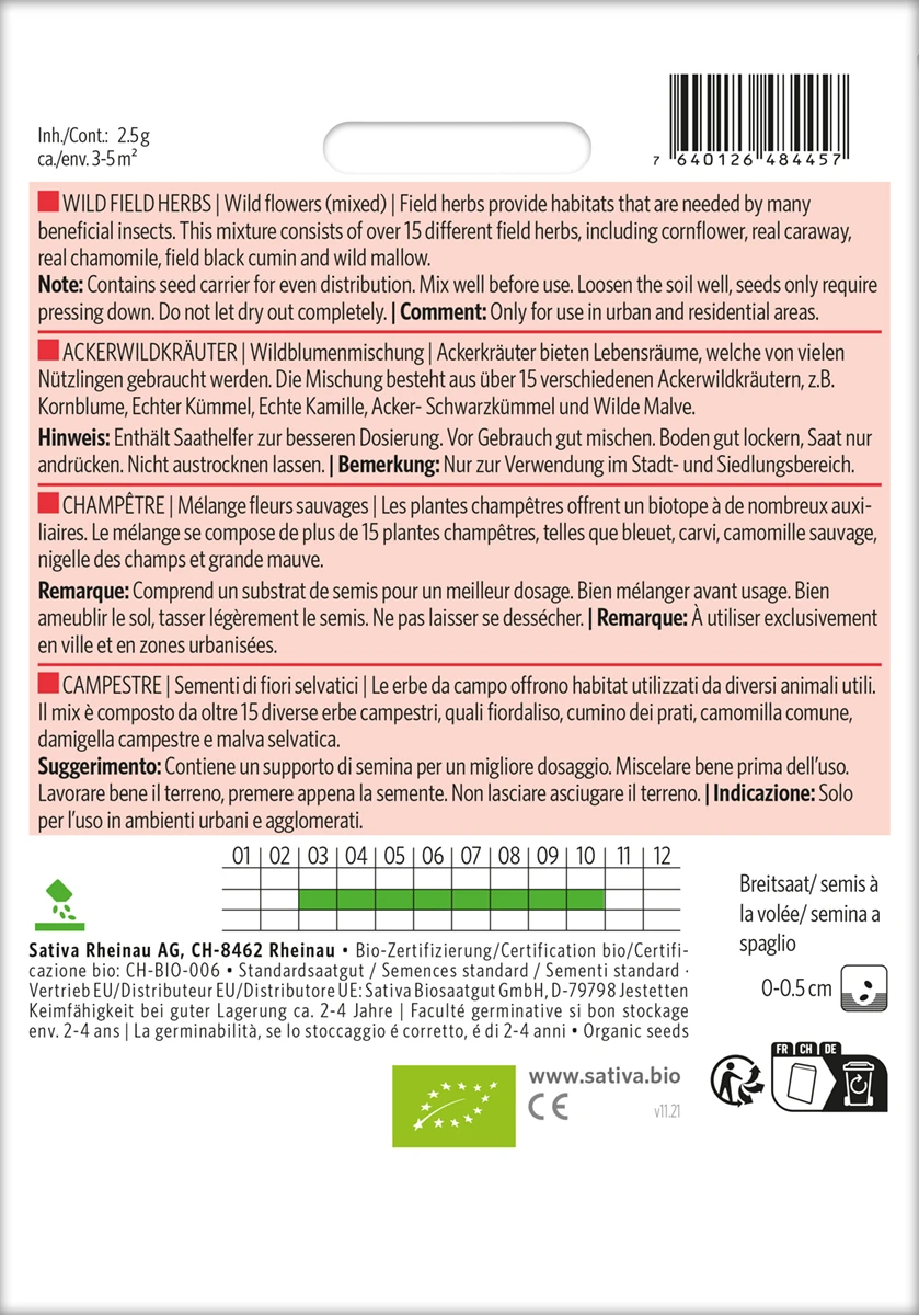 Die Mischung besteht aus 17 verschiedenen Ackerwildkräutern, z.B. Kornblume, Saat-Mohn, Venus-Frauenspiegel u.a.